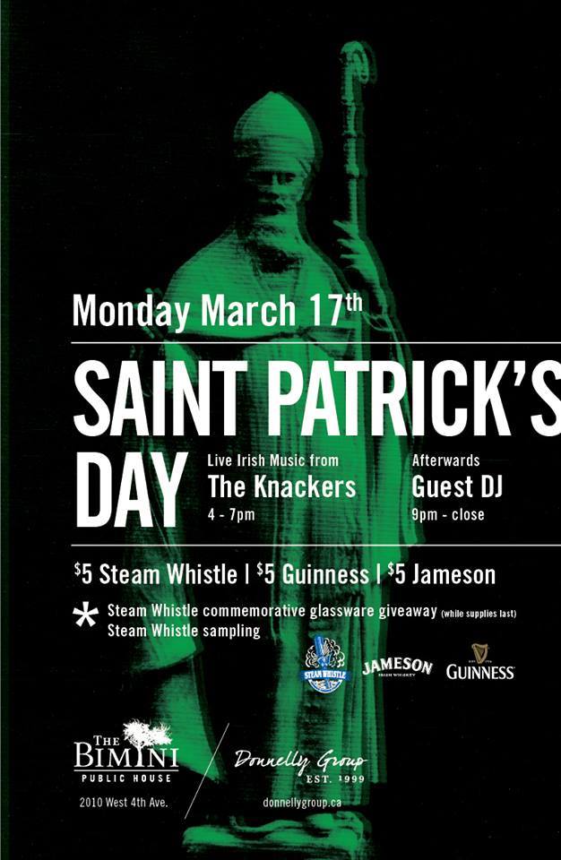 The Bimini Public House (2010 West 4th Avenue) is hosting an afternoon and evening filled with festivities, including live Irish music courtesy of The Knackers from 4pm to 7pm today, plus $5 Steam Whistle & Guinness beers and $5 Jameson whiskey, sampling and free stuff. That’s no blarney!