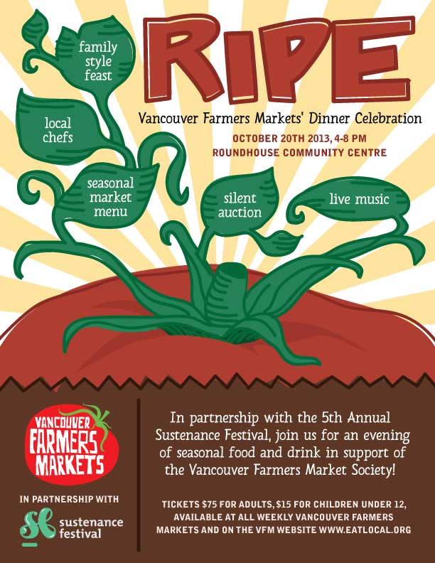 Save the date! On Sunday October 20th, 2013, the Vancouver Farmers Markets will present our annual dinner fundraiser RIPE, at the Exhibition Hall of the Roundhouse Community Centre. A family style feast of market food, RIPE is a harvest celebration of our farms and producers, and a feature event of the 5th Annual Sustenance Festival.